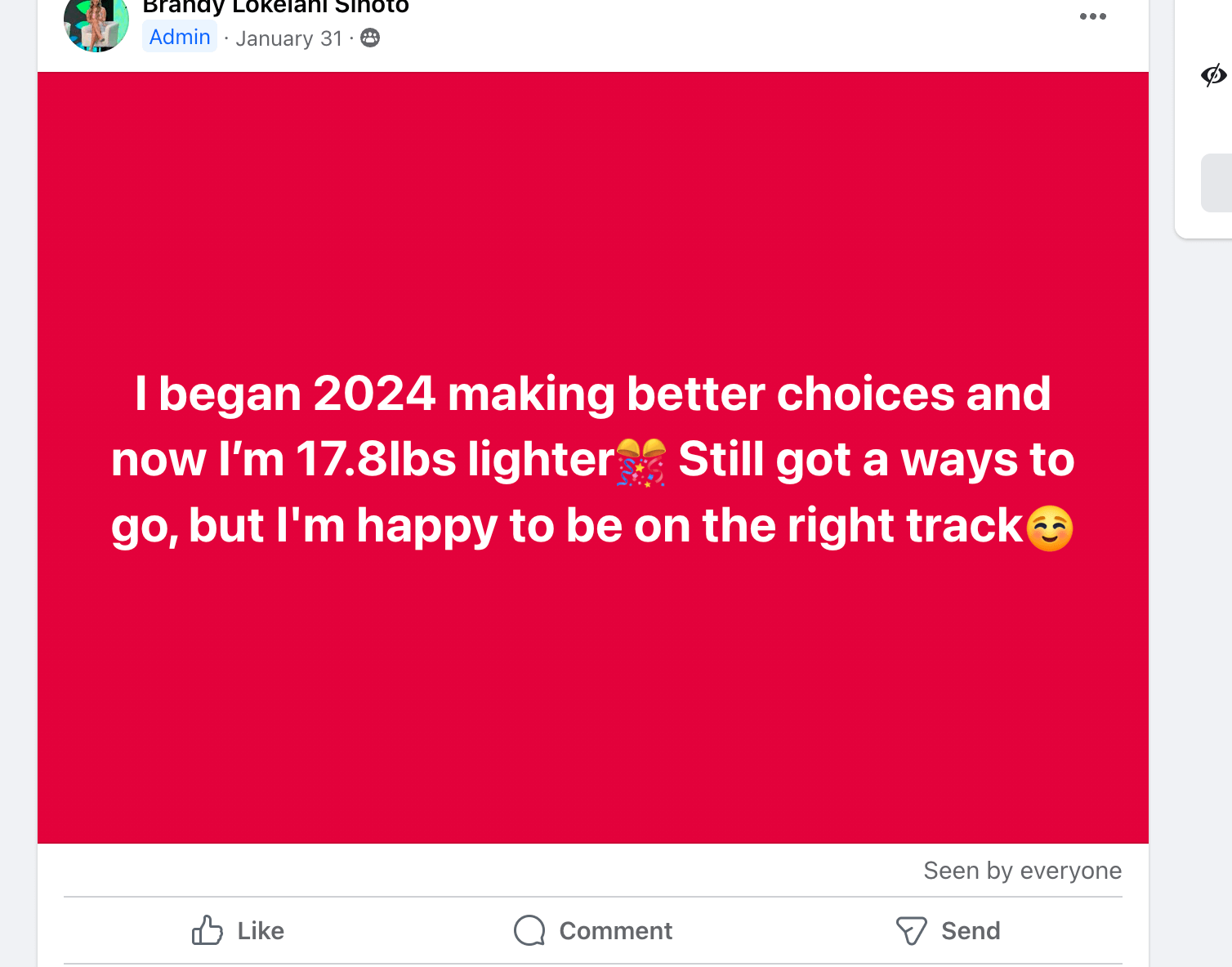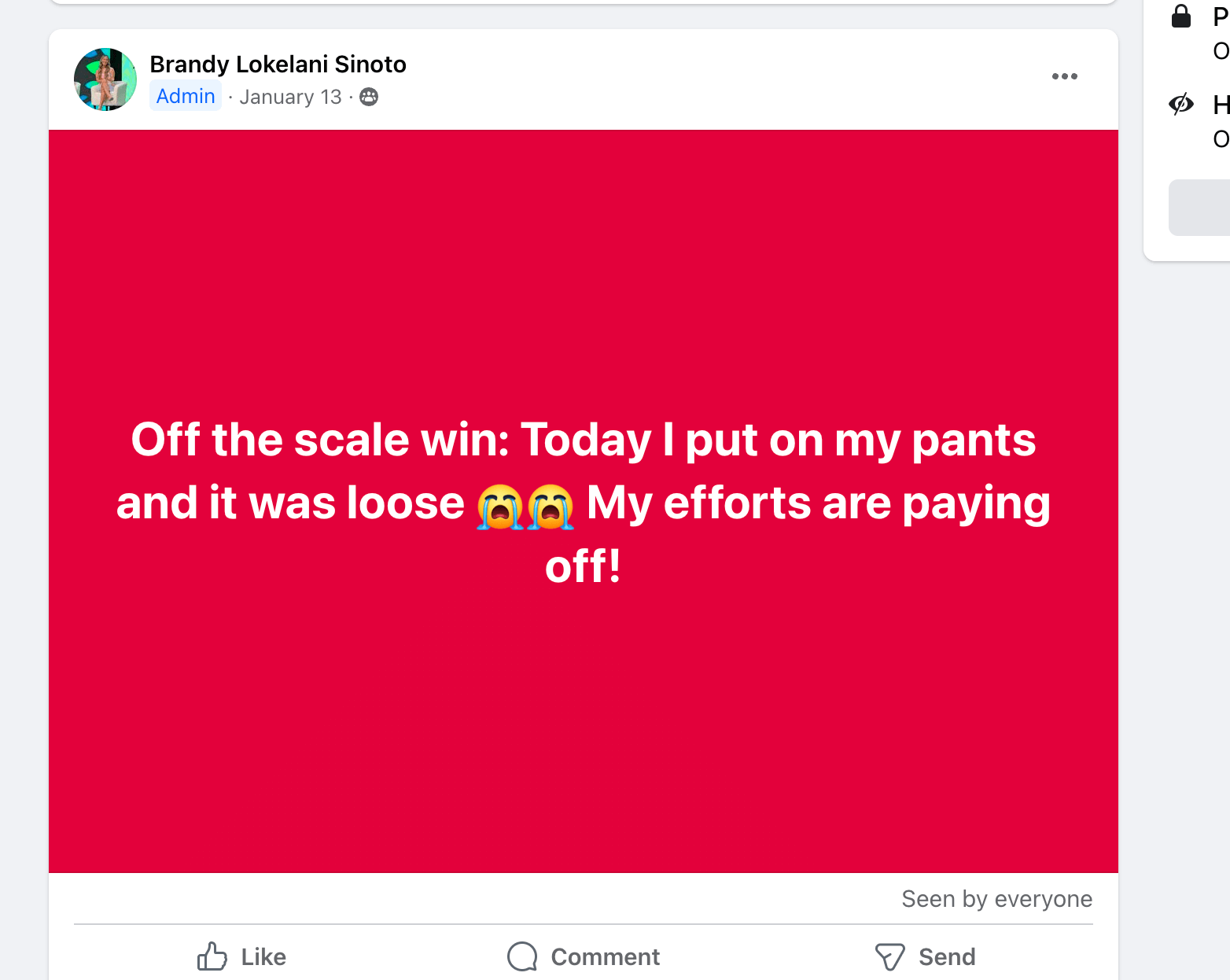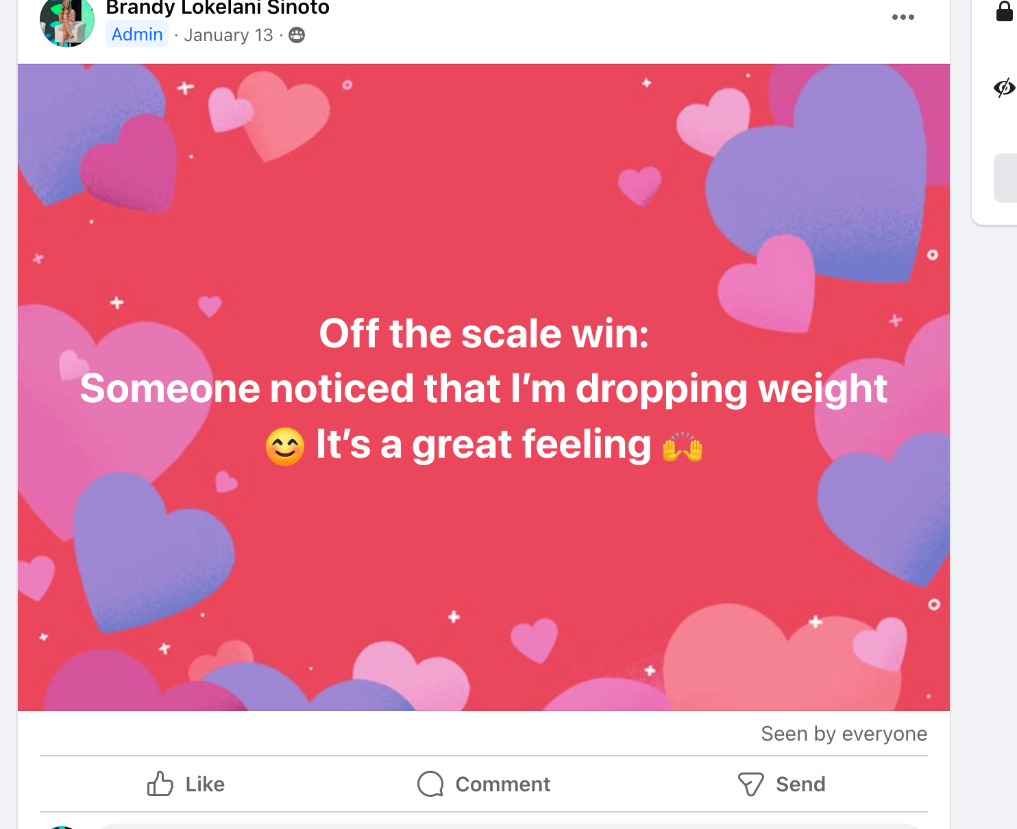 I am down...(share your story here, share you on the scale and off the scale wins. Do you have more energy? are you proud of yourself for sticking it out? Are you positively impacting others? share your story)