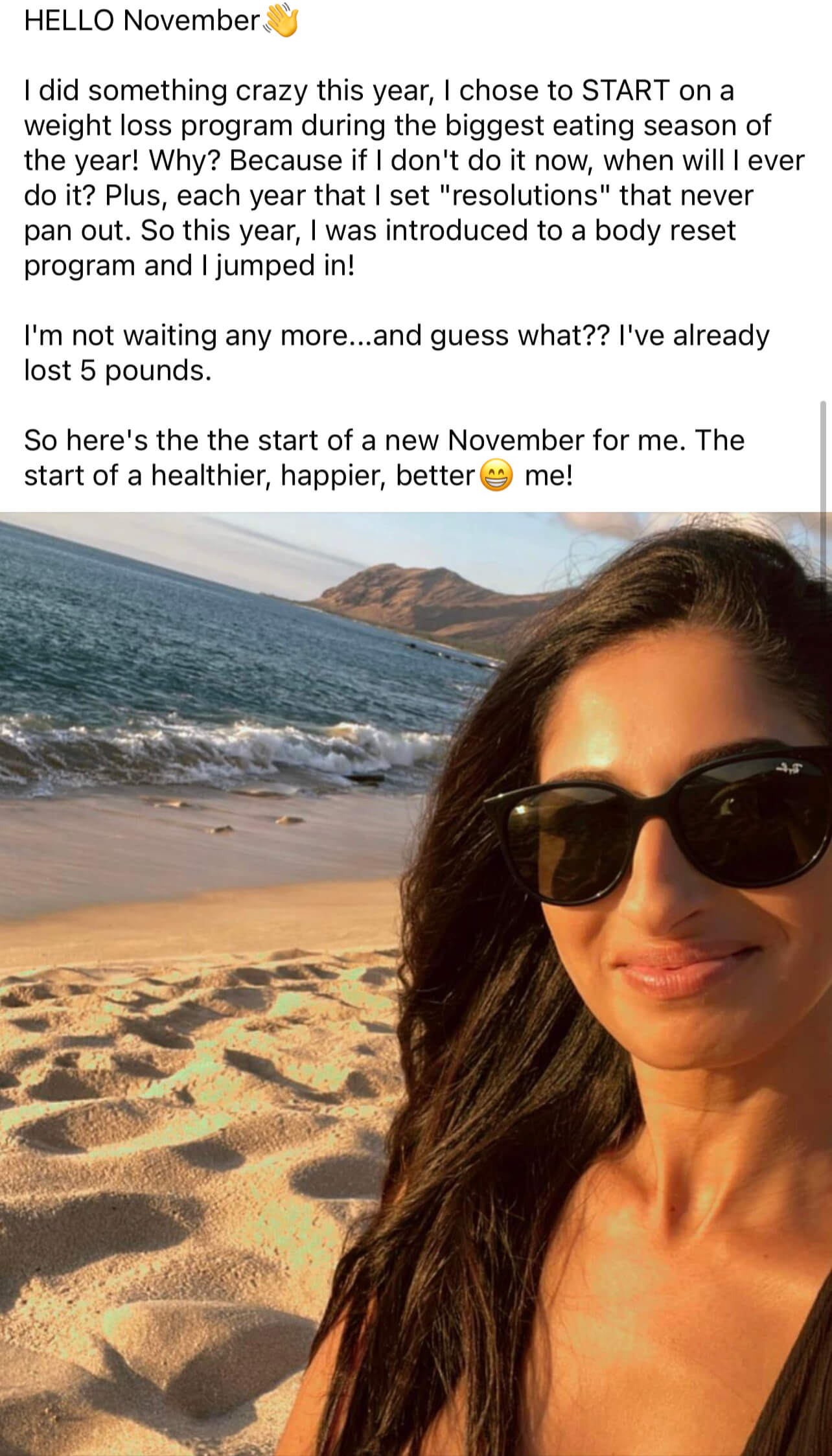- Create a post starting with "Hello November..." or "Heyyy November..." or "Hi November!" and share how excited you are that you're taking action to get healthy and drop some pounds during the busiest EATING season of the year.
