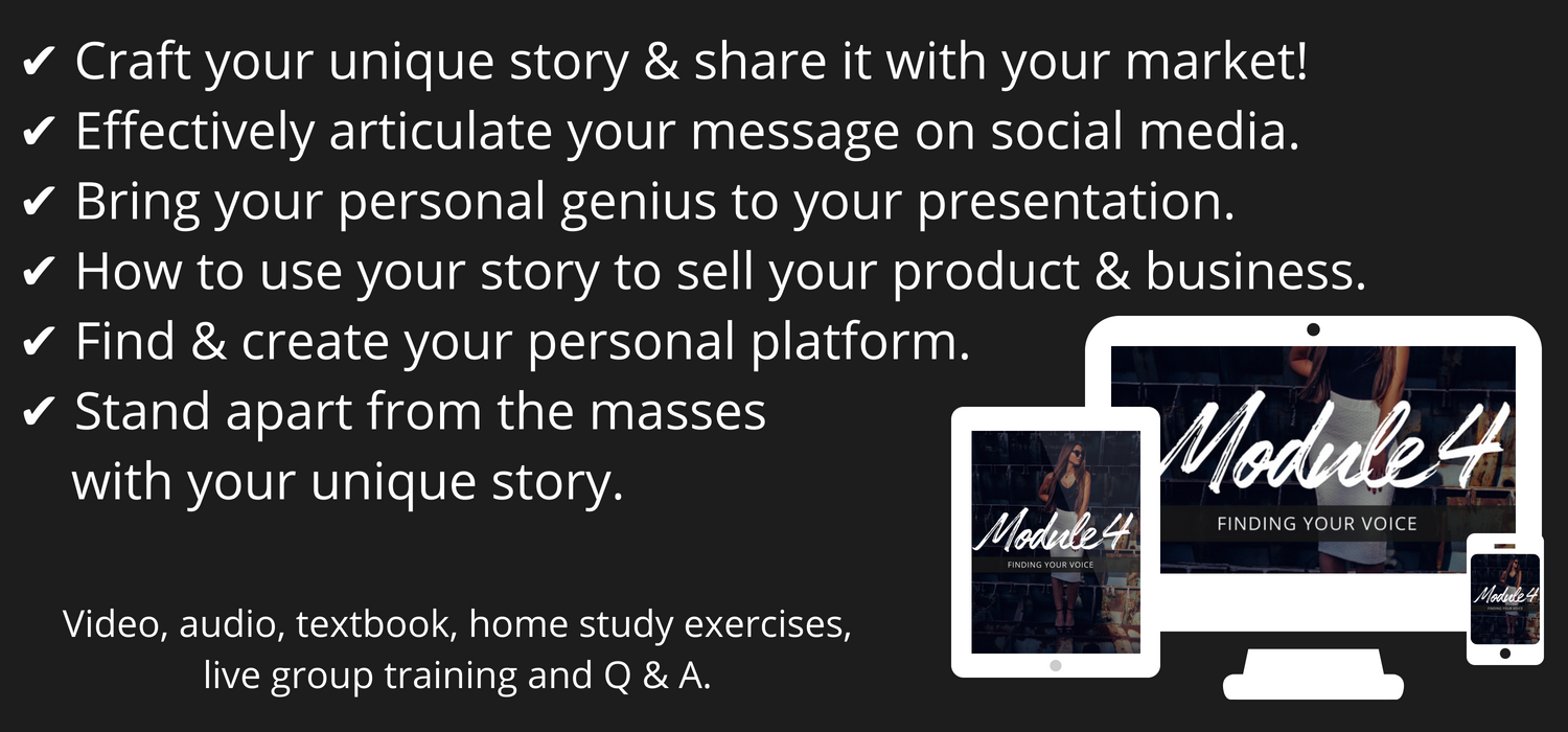 • Finding your voice, sharing your story & setting yourself apart from the masses, bringing your personal genius to your messaging.
