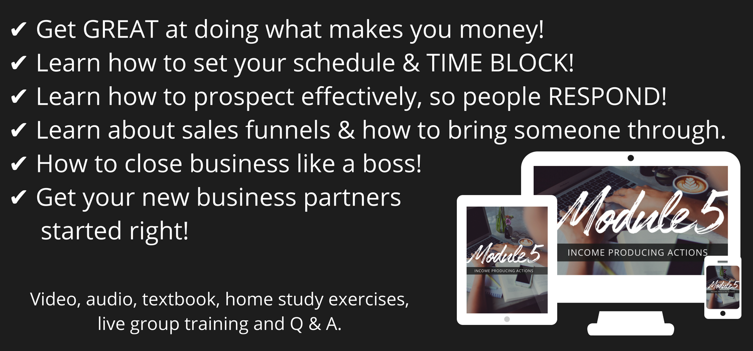 YOU'LL LEARN ABOUT INCOME PRODUCING ACTIONS, YOUR DAILY METHOD OF OPERATION, SETTING A SCHEDULE, AND HOW TO KEEP THE MONEY YOU MAKE. YOU'LL BE TAUGHT SKILLS AND STRATEGIES THAT TOP EARNERS KNOW AND UNDERSTAND BUT DON'T ALWAYS TEACH THEIR TEAMS!