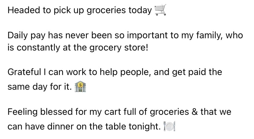 It’s a blessing waking up to a direct deposit, grateful I can help people, and get paid the same day. I was able to pay for a (add item).