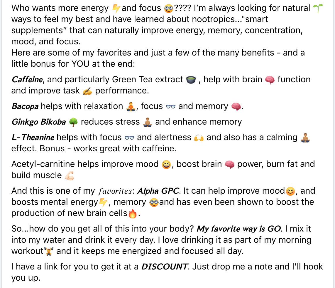 Who wants more energy ??and focus ?????? I’m always looking for natural ?? ways to feel my best and have learned about nootropics..."smart supplements” that can naturally improve energy, memory, concentration, mood, and focus.