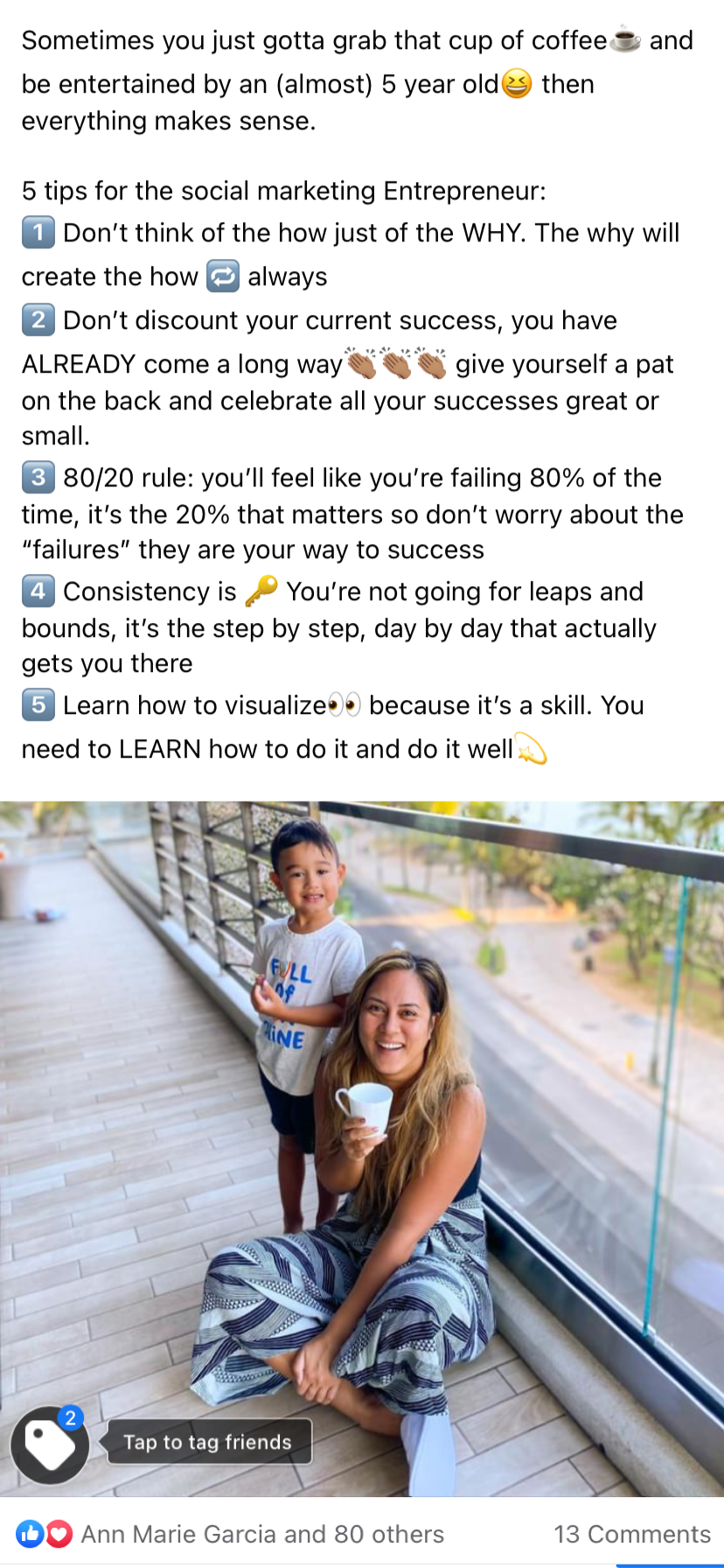 When you share these tips, this is a great way to 1) communicate with your team and encourage them 2) attract social marketers. You have people in your audience looking for a business and a mentor, doing posts like this attracts them to you 3) You create curiosity for those who don't know what you do. It's more than just selling products, it mentoring others to share!