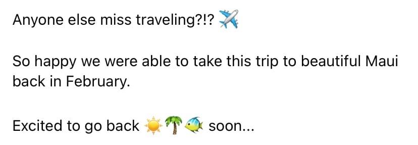 “Thinking back on this awesome trip to ______. What an incredible experience. Drop a pic below of your fave travel memory!