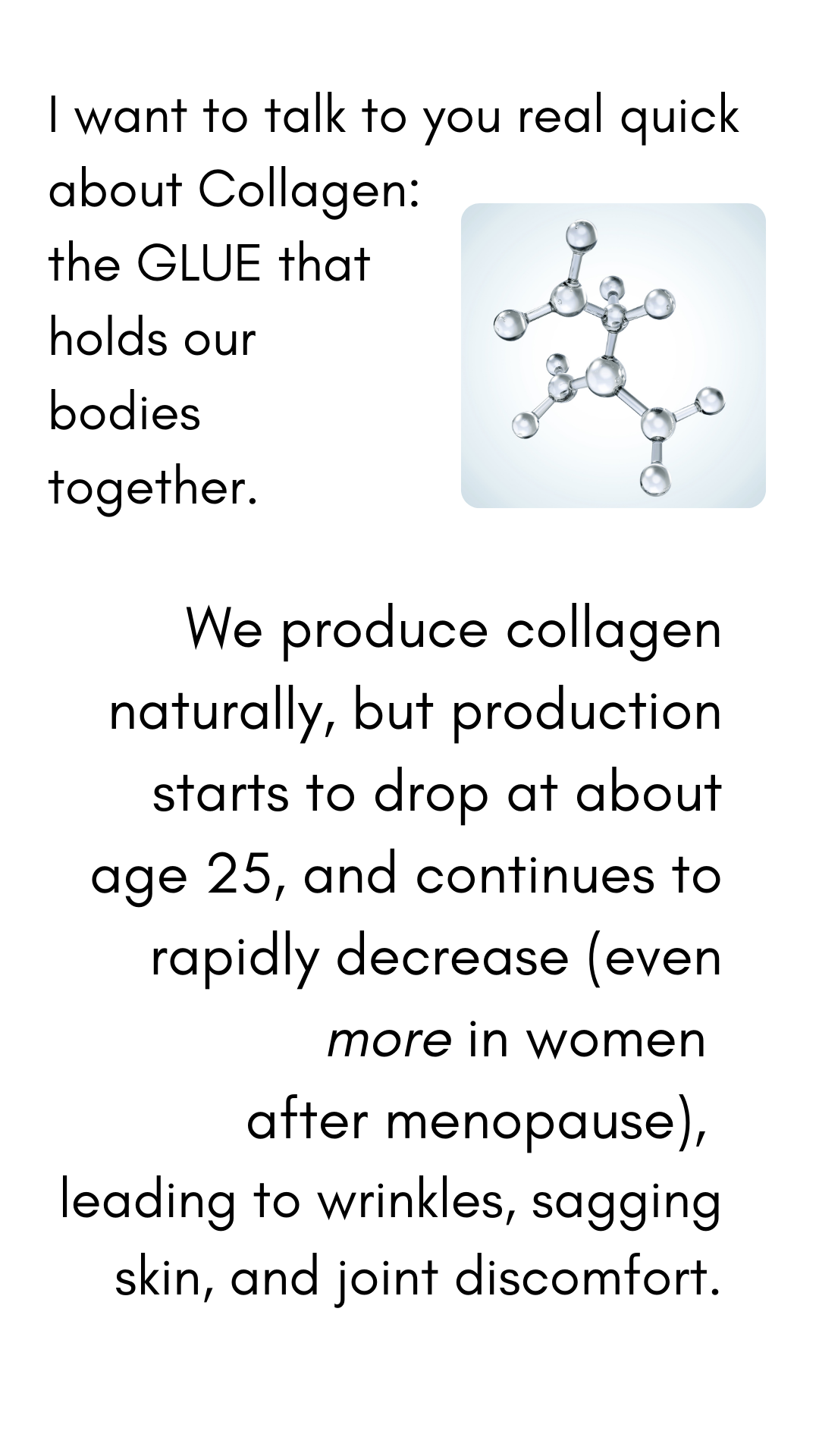 Our bodies produce collagen naturally and it is in abundance when young, (“baby soft skin”) but unfortunately 𝑝𝑟𝑜𝑑𝑢𝑐𝑡𝑖𝑜𝑛 𝑠𝑡𝑎𝑟𝑡𝑠 𝑡𝑜 𝑑𝑒𝑐𝑙𝑖𝑛𝑒 at about age 25, and continues to rapidly decrease as we age. It decreases even more in women after menopause. This decrease leads to wrinkles and sagging skin. There is no way to prevent collagen decreases in the body.