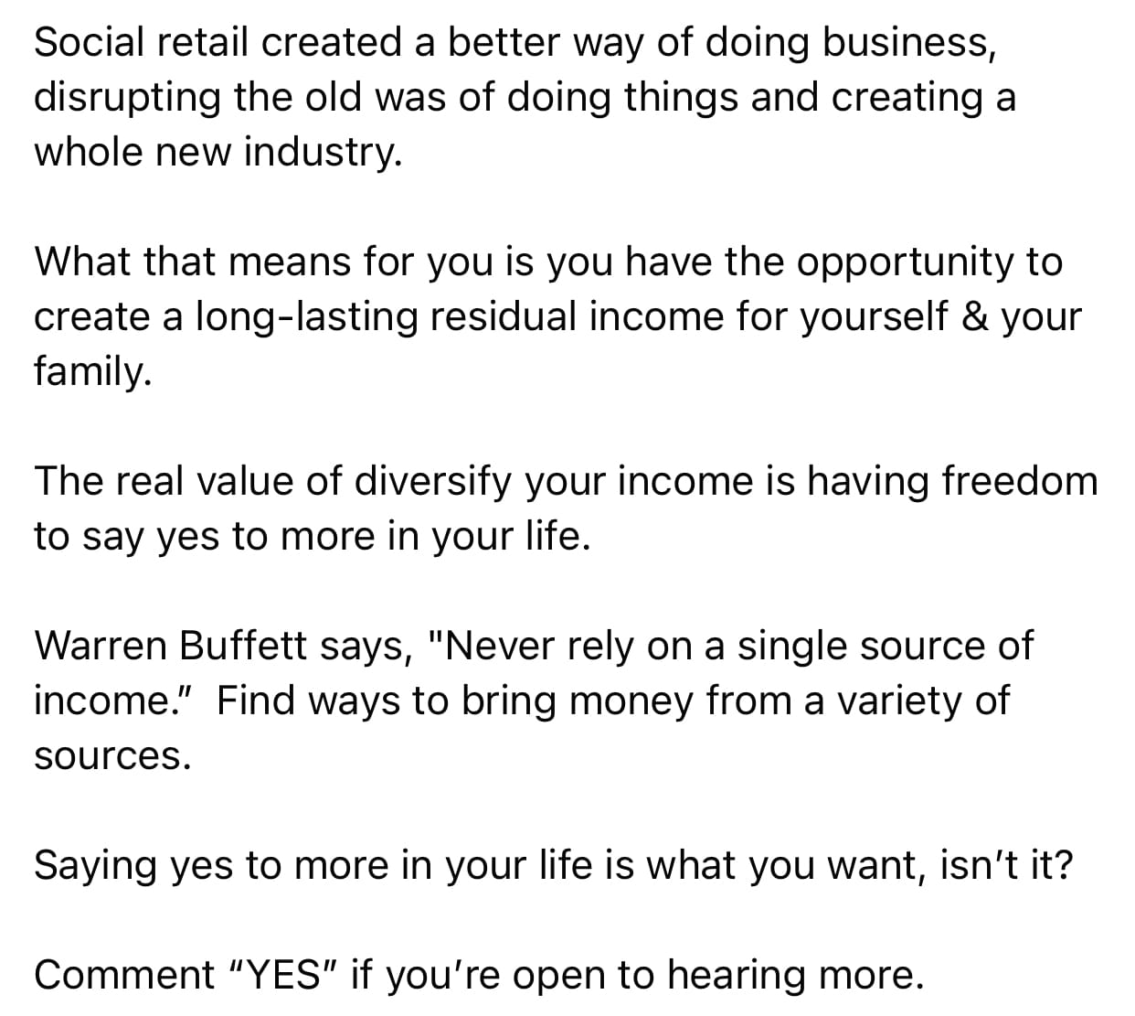 Social retail created a better way of doing business, disrupting the old ways of doing things and creating a whole new industry.What that means for you is you have the opportunity to create a long-lasting residual income for yourself & your family. The real value of diversifying your income is having freedom to say yes to more in your life. Warren Buffett says, "Never rely on a single source of income.” Find ways to bring money from a variety of sources.Saying yes to more in your life is what you want, isn’t it? Comment “YES” if you’re open to hearing more.