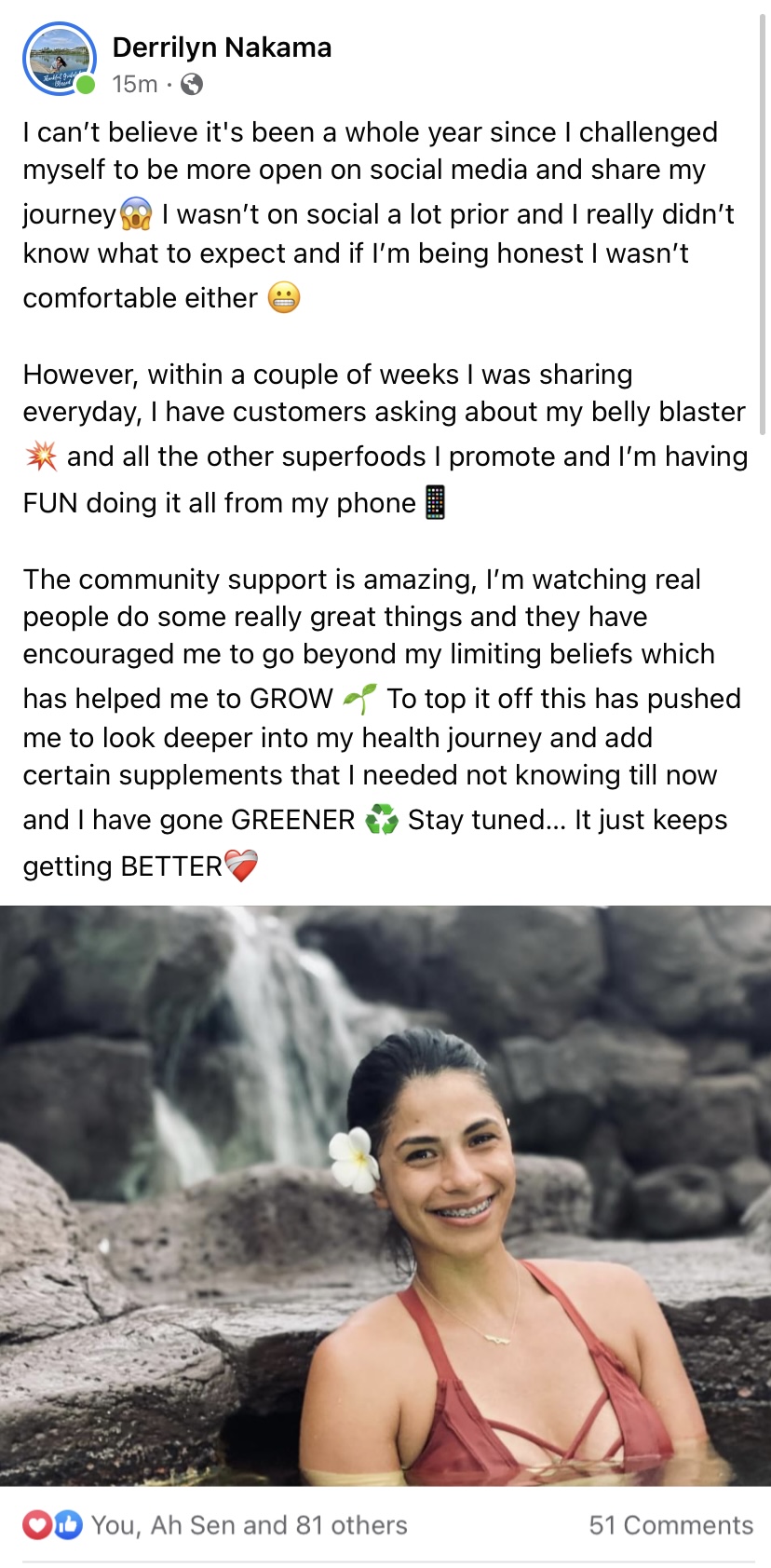 7 days ago (or state your time frame) I started a new challenge to share my journey here on social. It's something I never did before, I wasn't comfortable posting on social and I really didn't know what to expect. But just a week later and I'm sharing everyday, I have customers inquiring about my liquid gold and all the others superfoods I promote and I'm having so much fun and I get to do it all from my phone!