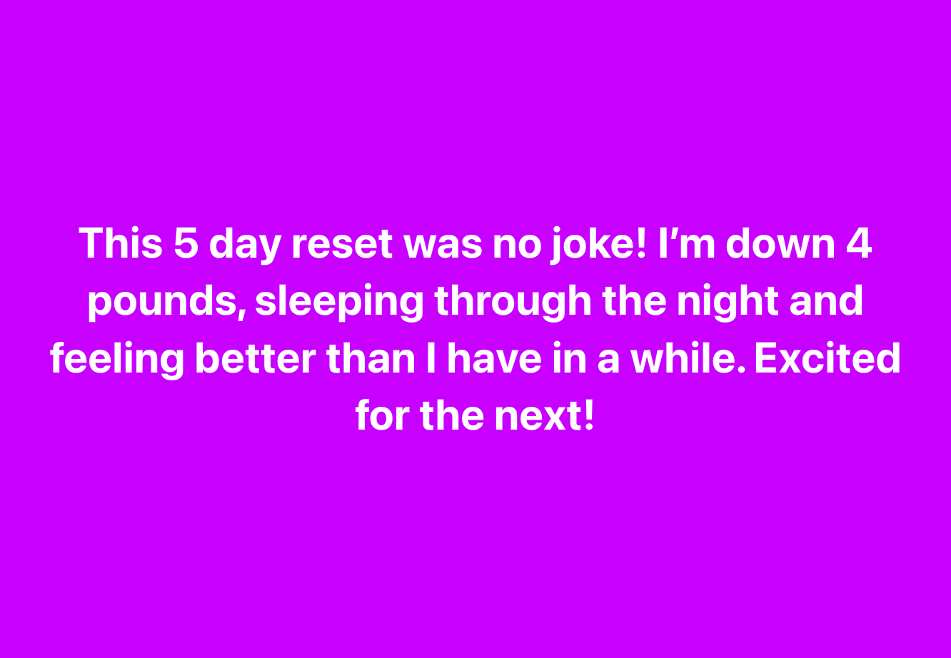This 5 day reset was no joke! I’m down 4 pounds, sleeping through the night and feeling better than I have in a while. Excited for the next!