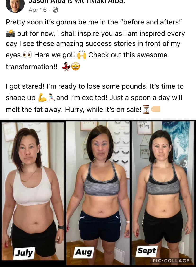 Share a picture of someone's weight loss success! Of course, If you have your own before and afters, share yours. But if not, it's ok, you have a limitless amount of success stories and testimonies to choose from!