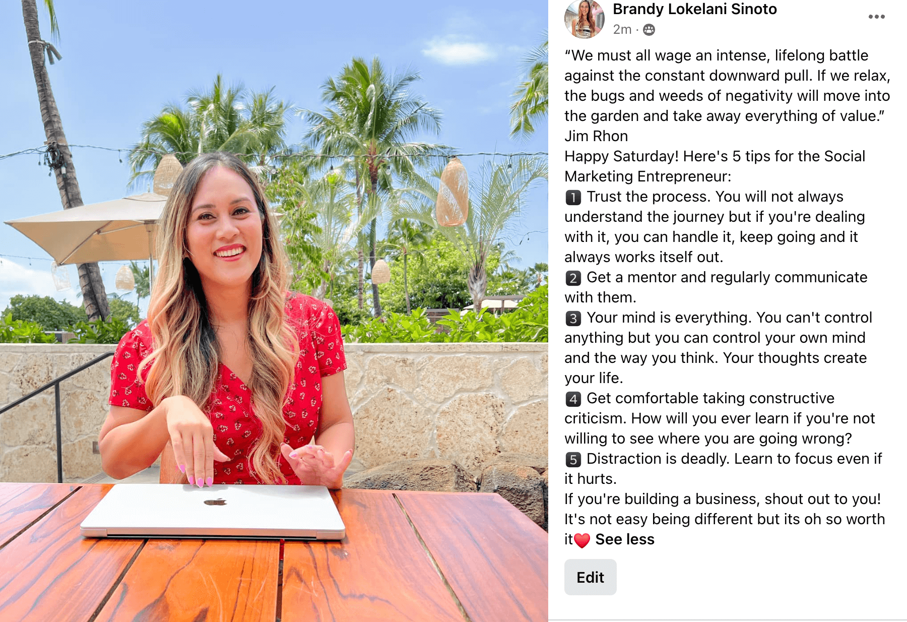 Then post a quote in the first paragraph and then share 5 tips to the social marketing entrepreneur. If you have been in this business for a day or if you've been in for a year, you can share advice to someone who is wanting to get started or who is daring to believe it's possible. Or you can share advice to the person who's wondering what it takes to be successful.
